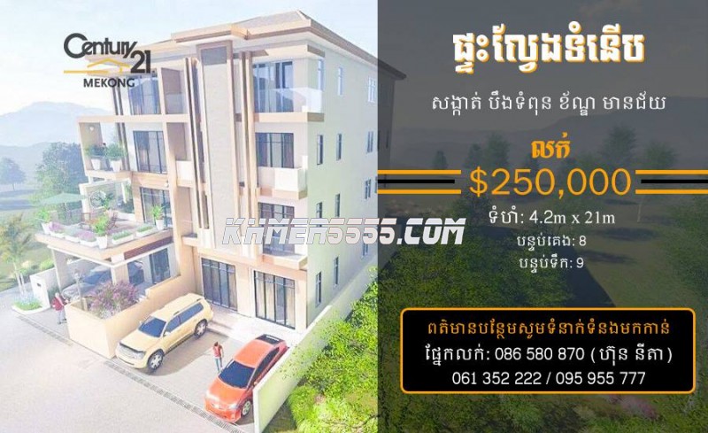 ផ្ទះល្វែងទំនើប ដែលមានបន្ទប់គេង៨ ដ៏ស្រស់ស្អាតដែលដាក់លក់លើតម្លៃ $250,000, ដែលមានទីតាំងនៅសង្កាត់បឹងទំពុន ខ័ណ្ឌមានជ័យ រាជធានីភ្នំពេញ។ រចនាបទទំនើបនិងល្អបំផុត ដែលមានបន្ទប់ទទួលភ្ញៀវធំទូលាយនិងមានភាពងាយស្រួលក្នុងការរស់នៅរឺប្រកបអាជីវកម្ម។