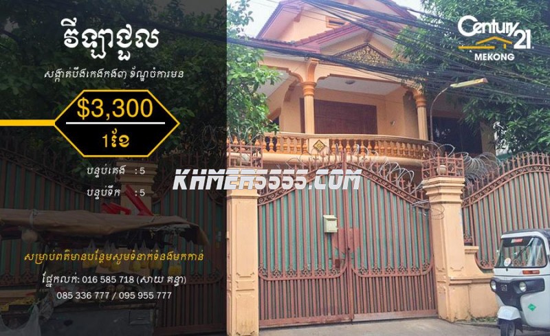 វីឡាទោលដ៏ស្រស់ស្អាតដែលមានបន្ទប់គេង៥ ដែលកំពុងដាក់ជួលលើតម្លៃ $3,300/ខែ, ដែលមានទីតាំងនៅ សង្កាត់ បឹងកេងកង៣ ខ័ណ្ឌចំការមន រាជធានីភ្នំពេញ។ កណ្តាលរាជធានី ដែលមានភាពល្អប្រសើរនិងមានភាពងាយស្រួលក្នុងការរស់នៅរឺប្រកអាជីវកម្ម។