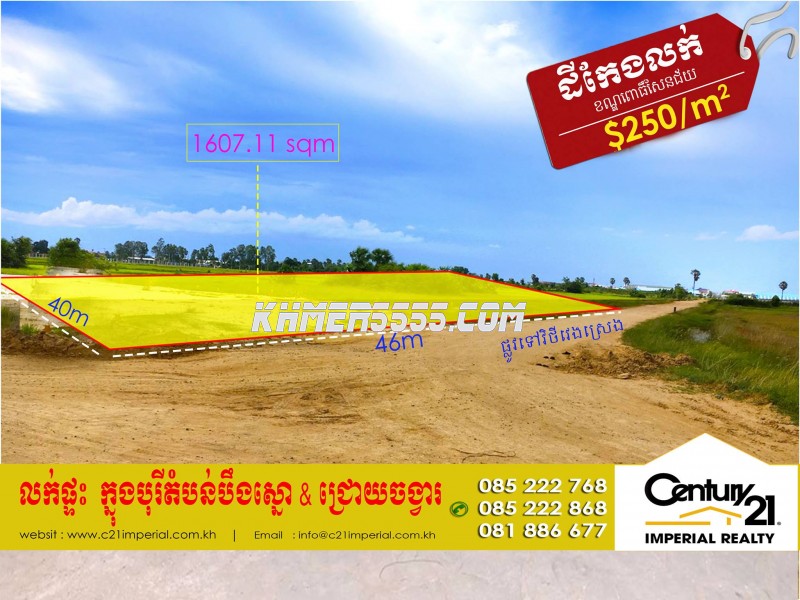 ដីលក់ទីតាំងល្អណាស់ រាងដីស្អាតណាស់ ជាប់ផ្លូវប្រលាយ32mផ្លូវទៅព្រលានយន្តហោះថ្មី